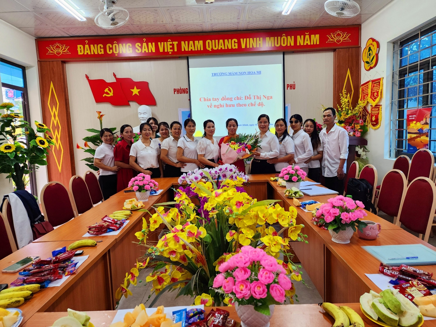 Hôm ngày 01 tháng 08 năm 2024 giáo viên Trường mầm non Hoạ Mi tổ chức chia tay một đồng chí đó là đồng chí Đỗ Thị Nga đã được nghỉ hưu theo quyết định Số: 853/QĐ- UBND Thành Phố Điện Biên Phủ ngày 14 tháng 05 năm 2024.