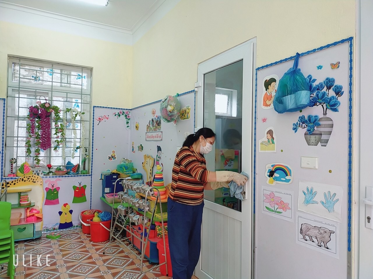 Nhà trường đã thực hiện nghiêm việc vệ sinh, tẩy trùng trường, lớp theo đúng hướng dẫn của Bộ Y tế và các cơ quan chuyên môn như: vệ sinh môi trường xung quanh, các vật dụng mà trẻ thường xuyên cầm, nắm, như: lan can hành lang, tay nắm cửa, bàn, ghế; giá, kệ để đồ dùng đồ chơi; phòng học, nhà vệ sinh…; thiết bị, đồ dùng dạy học và học liệu, bảo đảm ngăn ngừa nguy cơ lây nhiễm từ môi trường, lớp học và các phương tiện được giáo viên, học sinh sử dụng trong quá trình dạy và học.