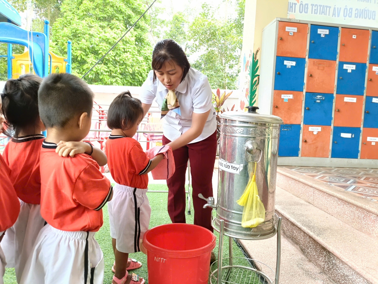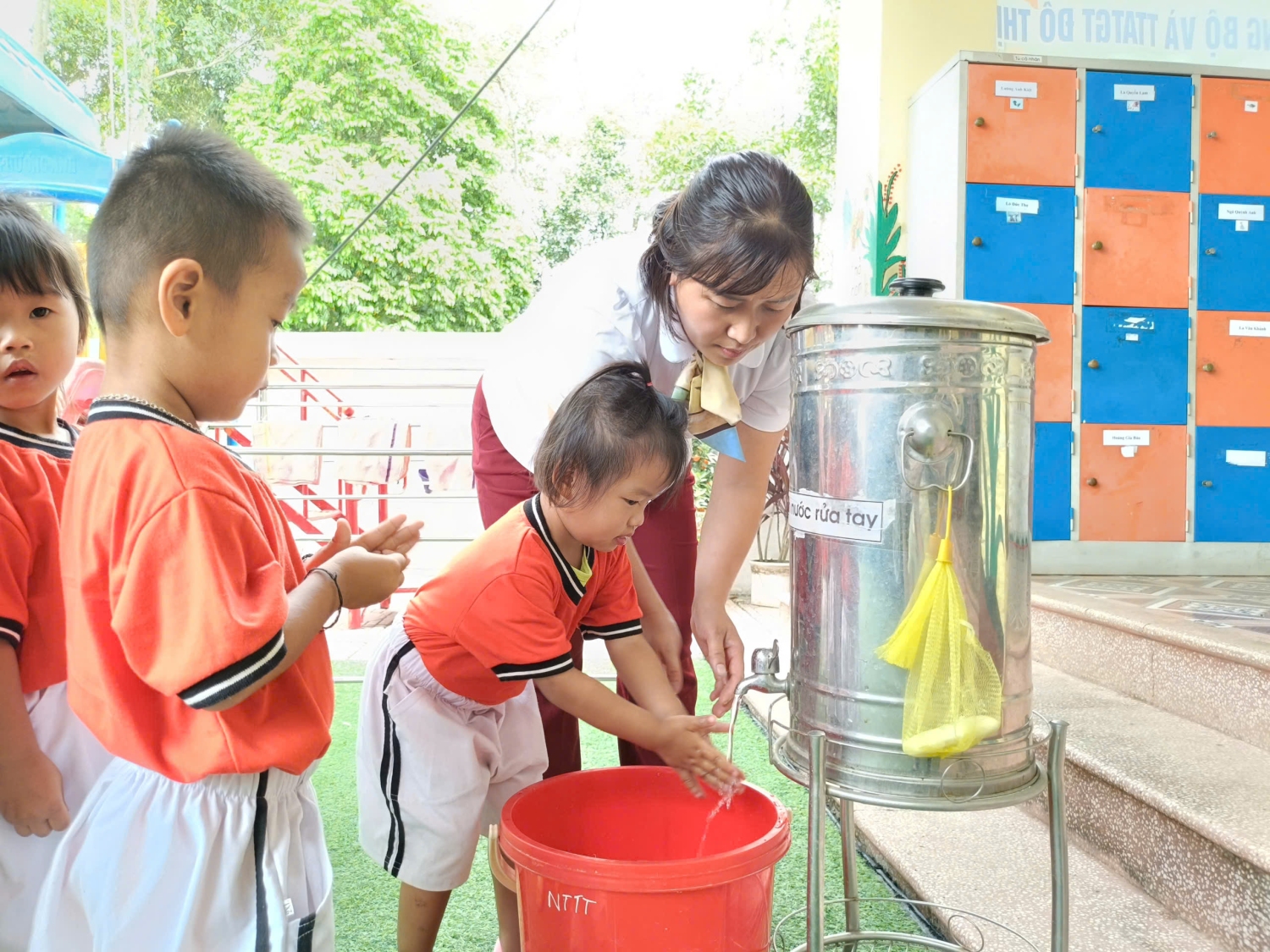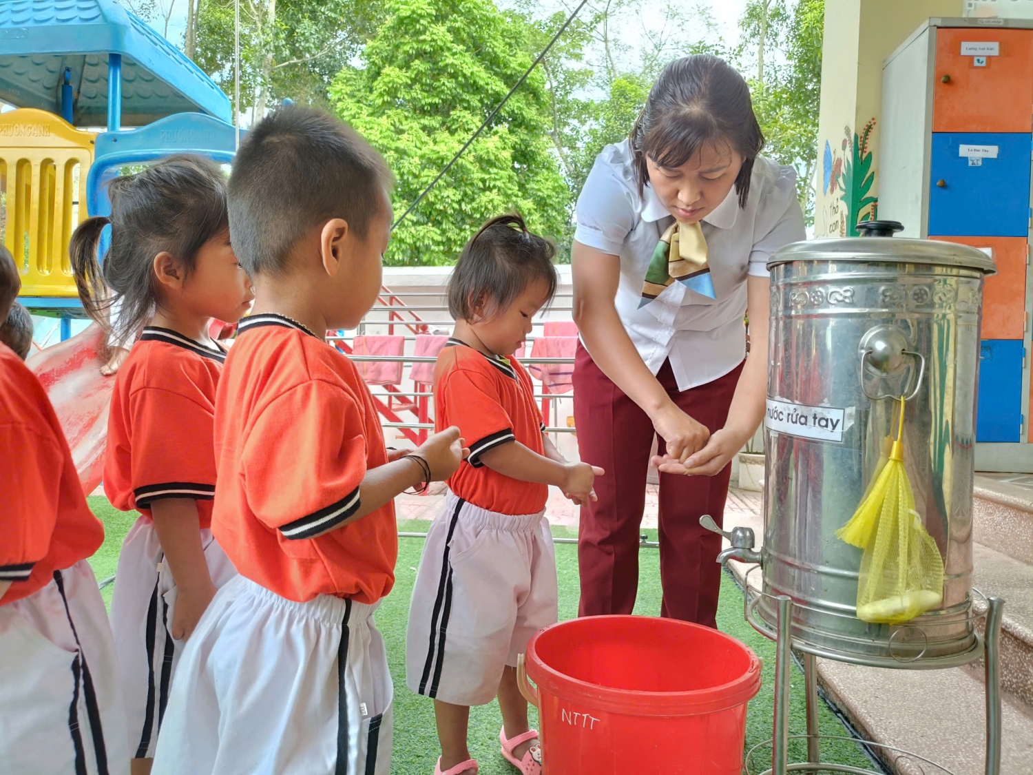 Saum no yog duab cws qhia xyuj xeeb rau qlais ntxuav tes => Dưới đây là hình ảnh cô hướng dẫn trẻ rửa tay bằng 6 bước.