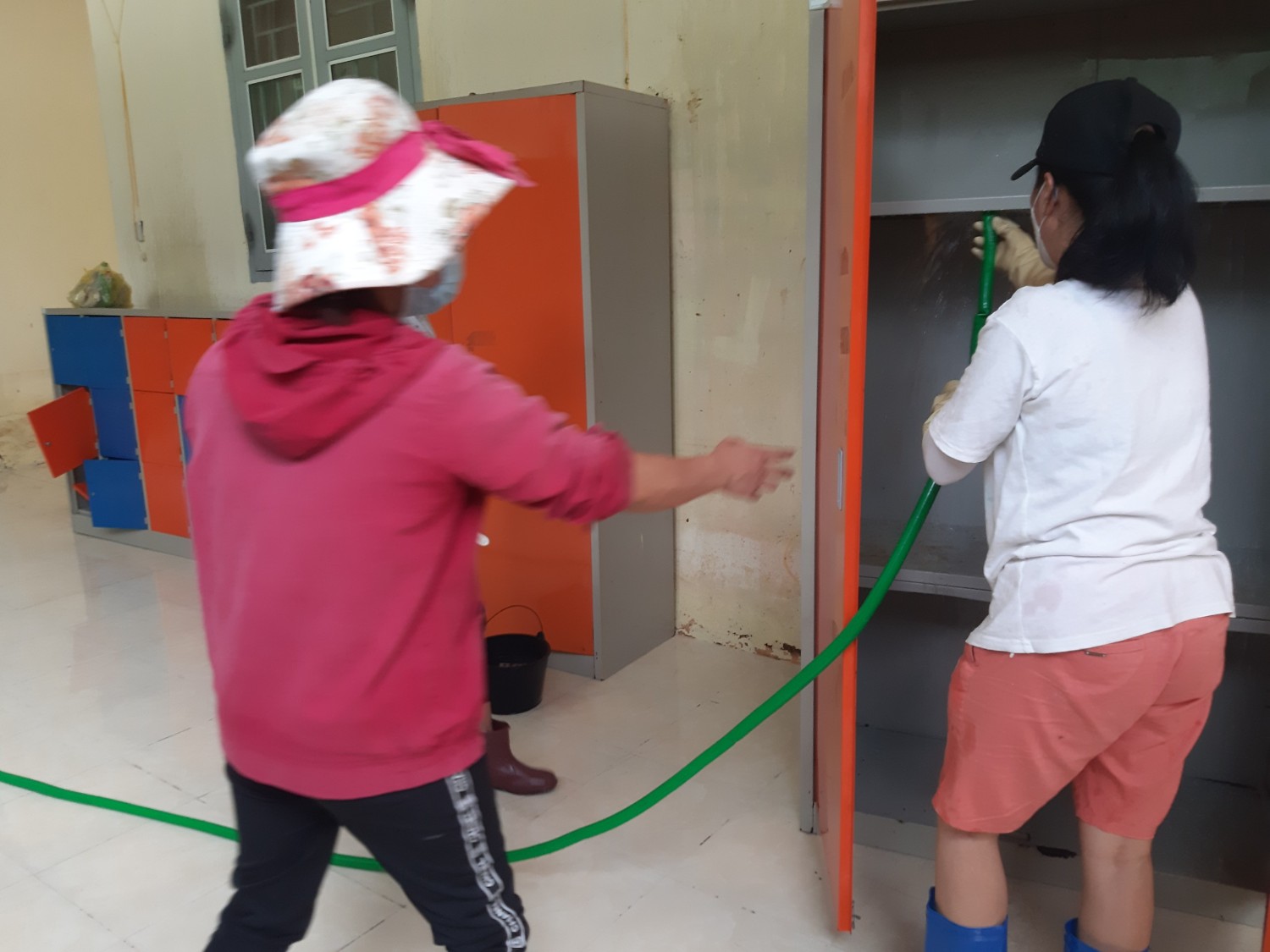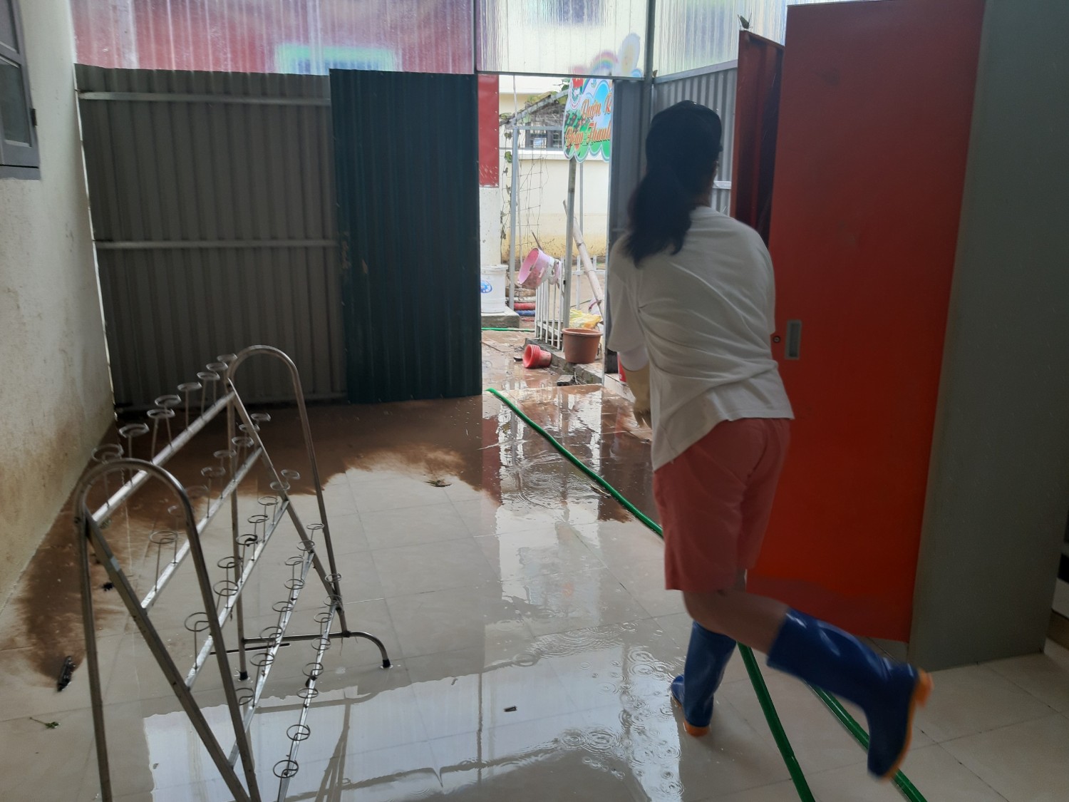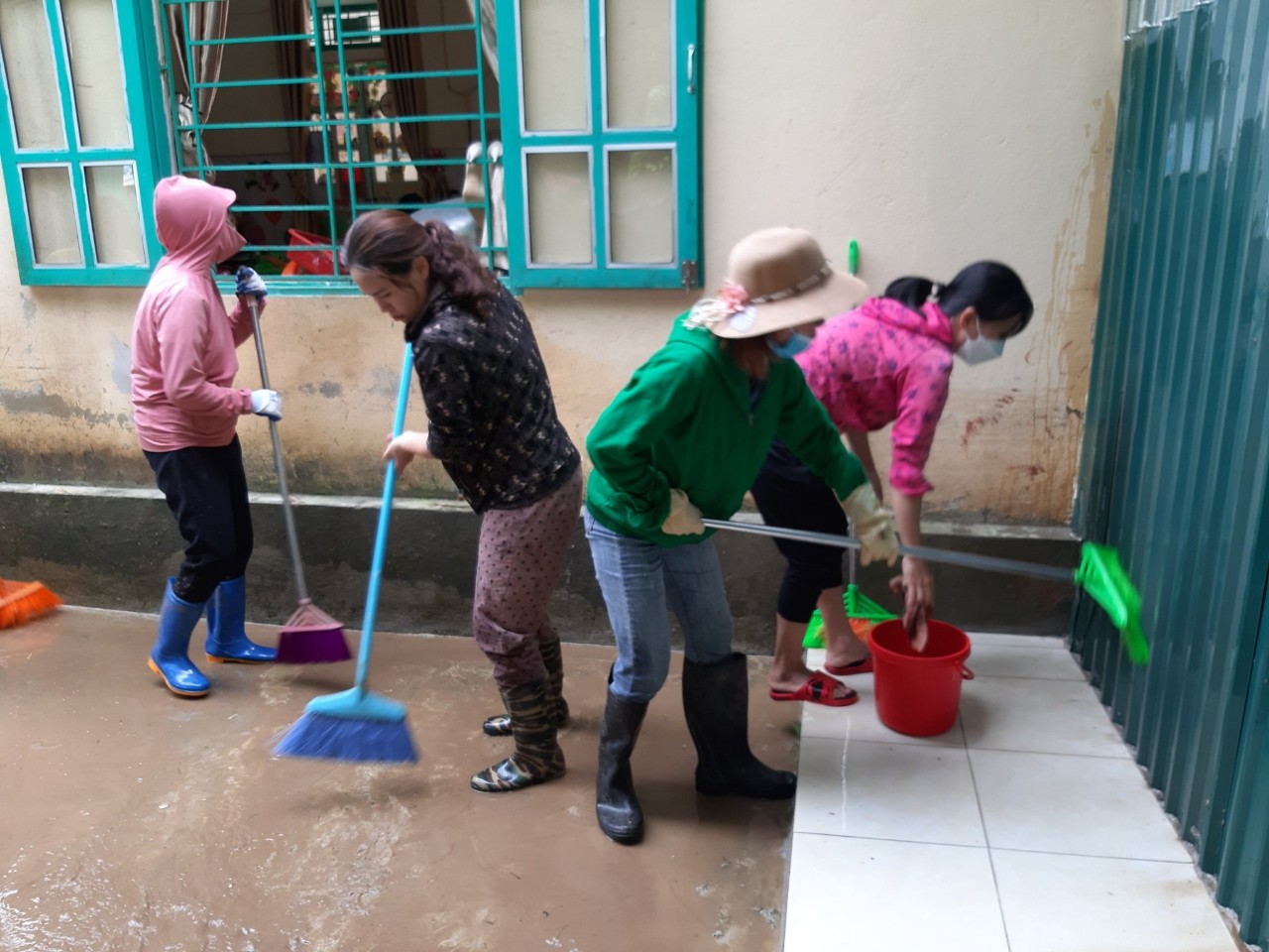Trường MN Họa Mi giúp trường MN số 1 Pa Khoang khắc phục lũ lụt sau mưa