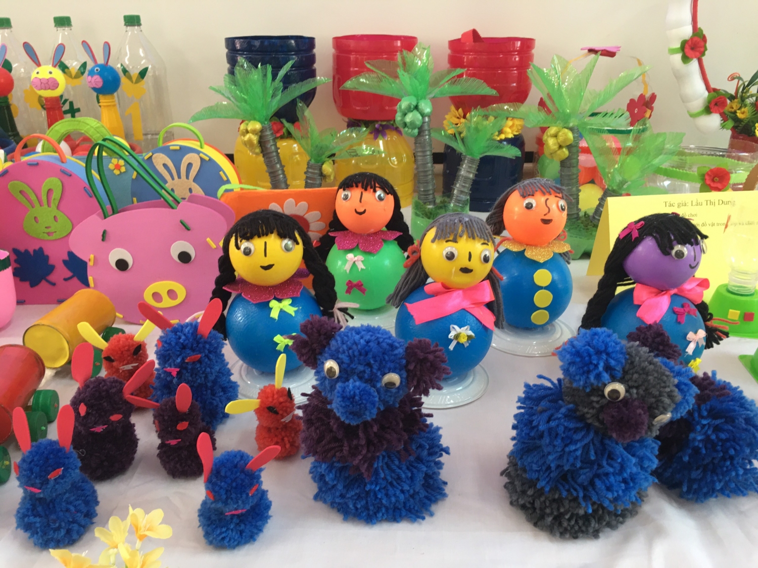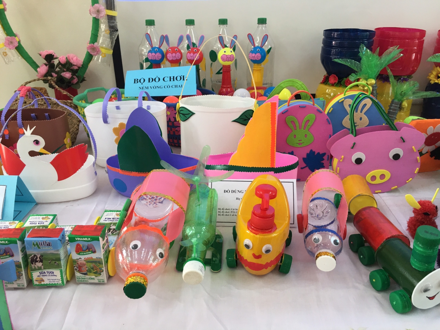 Hưởng ứng phong trào thi đua ‘Làm đồ dùng, đồ chơi sáng tạo’ của trường Mầm Non Hoạ Mi, tất cả các cán bộ giáo viên 6 lớp hưởng ứng làm đồ dùng đồ chơi phục vụ cho việc dạy và học của trẻ với số lượng đồ dùng đồ chơi nhiều và đa dạng. Cùng với bàn tay khéo léo, trí tưởng tượng của các cô và các con để ứng dụng dạy học và phục vụ cho nhu cầu vui chơi của trẻ trong năm học. Ai trong chúng ta cũng biết đến việc làm đồ dùng, đồ chơi MN là cách hữu hiệu nhất giúp trẻ thực hiện các hoạt động, đồng thời cũng chính là cách để trẻ tiếp thu, lĩnh hội các kiến thức một cách nhiệt tình, hứng thú và hiệu quả nhất.Nhận thức được điều đó, đội ngũ GV các lớp luôn biết cách tận dụng các nguyên liệu sẵn có trong gia đình và địa phương, chẳng hạn như: vỏ chai nước giải khát, vỏ hộp sữa, chai nước rửa tay, ống nhựa, que kem, quả cầu lông, các miếng gỗ nhỏ..... góp phần bảo vệ môi trường sạch đẹp, đồng thời cũng sáng tạo ra nhiều mô hình đồ dùng, đồ chơi độc đáo.Sau đây là đồ dùng đồ chơi của giáo viên làm dùng cho việc thoả mán nhu cầu hoc và vui chơi của trẻ với màu sắc sặc sỡ đẹp rực rỡ, với nhiều đồ đồ dùng được trưng bày