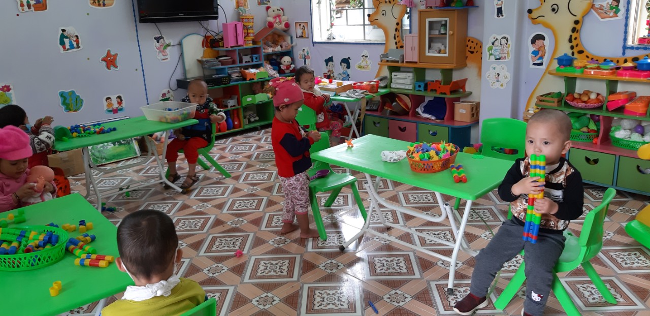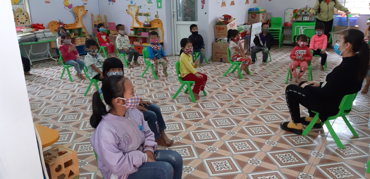 Tại các lớp học, các con được các cô duy trì thường xuyên công tác đeo khẩu trang trong lớp, trong hoạt động học các bé luôn giữ khoảng cách vị trí ngồi đảm bảo an toàn theo đúng quy định của lớp học....
