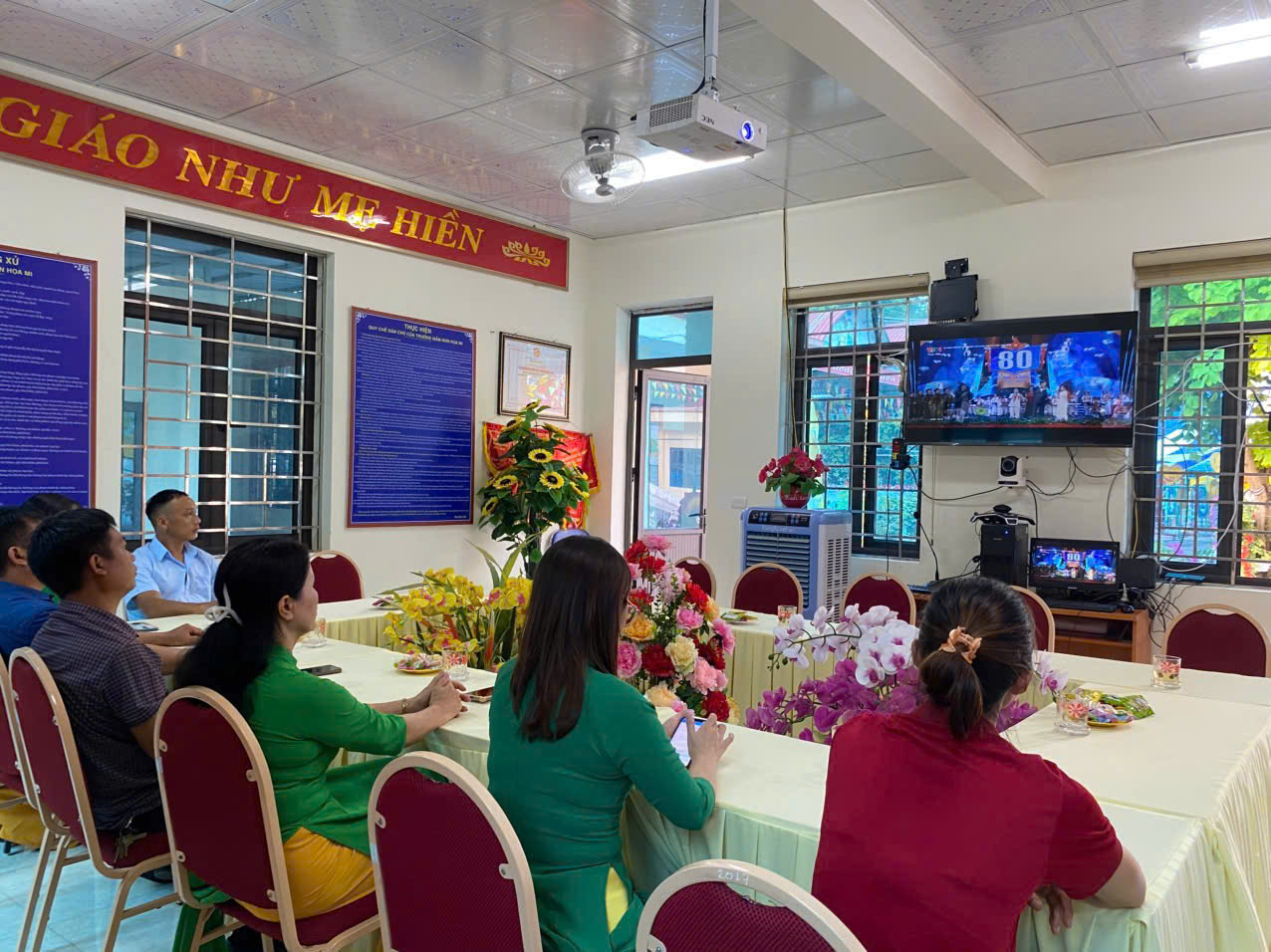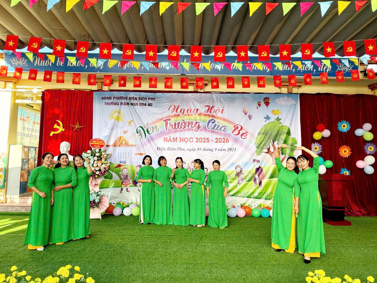 Hôm nay sáng ngày 5/9/2025 trong không khí trang trọng và rộn ràng của ngày toàn dân đưa trẻ đến trường, trường Mầm non Hoạ Mi tổ chức Lễ Khai giảng năm học 2025–2026 và tiếp sóng Lễ kỷ niệm 80 năm truyền thống ngành giáo dục của Bộ GD&ĐT - một sự kiện lịch sử đầy ý nghĩa đánh dấu hành trình xây dựng và phát triển của nền giáo dục Việt Nam, gắn với 80 mùa xuân hào hùng và tươi đẹp của đất nước. Tham dự buổi lễ khai giảng với nhà trường có Bà Lò Thị Thanh – Ủy viên BCH Đảng bộ, phó trưởng ban VH-XH HĐND phường Điện Biên Phủ, đơn vị kết nghĩa, đại diện hội cha mẹ học sinh nhà trường và hội trưởng hội phụ huynh của các lớp. Đ/c Nguyễn Thị Hằng – Bí thư chi bộ, Phó hiệu trưởng nhà trường,Đ/c Lê Thị Hồng phó hiệu trưởng nhà trường, cùng các Đ/c giáo viên, nhân viên, các bậc phụ huynh và toàn thể các cháu học sinh trong nhà trường. Trong buổi lễ khai giảng đầu năm học thì không thể thiếu đó là các tiết mục văn nghệ sôi động, đáng yêu đã góp phần mang lại không khí rộn ràng, cho buổi lễ tràn ngập niềm vui. Phần lễ trực tiếp tại sân trường của chúng ta xin được khép lại tại đây. Và ngay sau đây là: kính mời quý vị, thầy cô và các em học sinh tiếp tục theo dõi chương trình: “Khai giảng trực tuyến năm học 2025-2026 trên nền tảng trực tuyến của nhà trường, trong chương trình các cô và các bé đã được lắng nghe diễn văn của Bộ trưởng bộ GD-ĐT Nguyễn Kim Sơn, xem lại quá trình phát triển của nền giáo dục nước nhà qua chặng đường 80 năm và lắng nghe tiếng trống khai giảng năm học mới của Tổng bí thư Tô Lâm . Với sự quan tâm của các cấp lãnh đạo và tình cảm nồng nhiệt của các bậc phụ huynh cũng như nhân dân trên địa bàn, cùng với niềm tự hào lan tỏa trong mỗi giáo viên sau khi xem lại chặng đường 80 năm giáo dục phát triển đất nước càng khiến nhà trường và các cô giáo thổi bùng lên niềm tin vững bước tiến vào năm học mới. Buổi lễ khai giảng đã kết thúc trong niềm hân hoan của cả cô và trò trong nhà trường.Tạo được không khí vui tươi và phấn khởi ngập tràn niềm vui, tự hào và thành công.