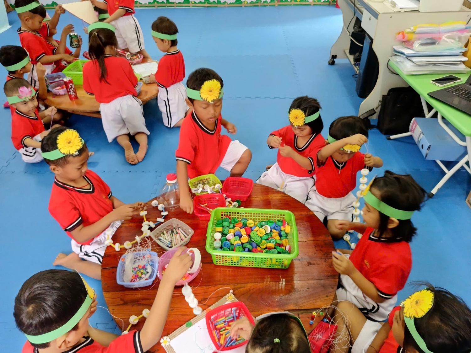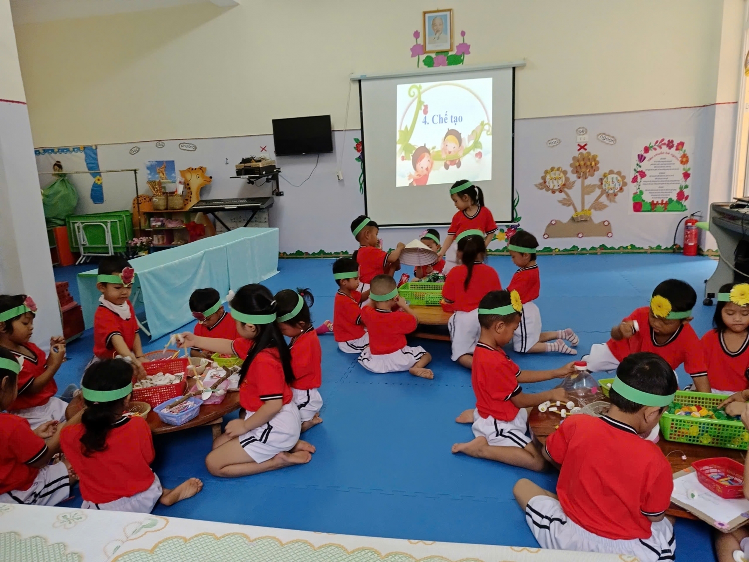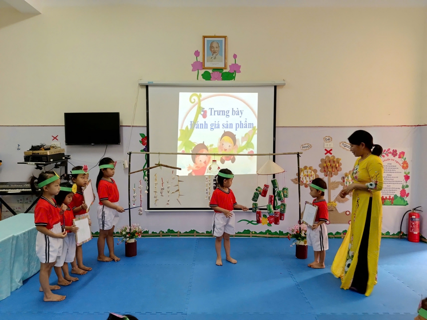 Áp dụng quy trình thiết kế kỹ thuật (EDP), tổ chuyên môn đã tổ chức thực hiện đề tài "Làm chuông gió - EDP" do cô giáo Lầu Thị Dung thực hiện trực tiếp tại lớp MGG 4-5 tuổi Trung Tâm. Với mục đích giúp trẻ phát triển các kỹ năng tư duy phản biện, giải quyết vấn đề, sáng tạo và hợp tác. Trẻ được khám phá để tiếp nhận các kiến thức, kỹ năng từ đó hiểu, ghi nhớ nhanh hơn và phát huy khả năng quan sát, nhanh nhạy, thử nghiệm, giải thích, đặt câu hỏi để tìm nguyên nhân và đưa ra các suy luận/ kết luận. Cô chia trẻ thành 3 nhóm cùng thảo luận để đưa ra ý tưởng thiết kế chiếc chuông gió của đội mình. Trẻ được sử dụng các dụng cụ và nguyên vật liệu đơn giản như: Kéo, ống hút nhựa, nắp chai, vỏ sò, vỏ lon bia, lon nước ngọt, cành khô, nón lá, bình nhựa, dây len,...để làm chiếc chuông gió. Sản phẩm đạt được trên cả mong đợi, 3 đội đã hoàn thiện được 3 chiếc chuông gió với ý tưởng và nguyên vật liệu khác nhau, trẻ còn tự tin thuyết trình và giới thiệu được sản phẩm của mình. Qua đó, cho chúng ta thấy được khi vận dụng quy trình thiết kế kỹ thuật (EDP) trong tổ chức hoạt động cho trẻ mang lại lợi ích tuyệt vời, hỗ trợ các bé khám phá tiềm năng của bản thân, hình thành kỹ năng cần thiết để vận dụng và phát triển trong thế giới công nghệ hiện đại. Trẻ sẽ có những hoạt động, bài học, trò chơi thú vị kích thích trí tò mò, sự sáng tạo và phát huy khả năng tiềm ẩn của bé.