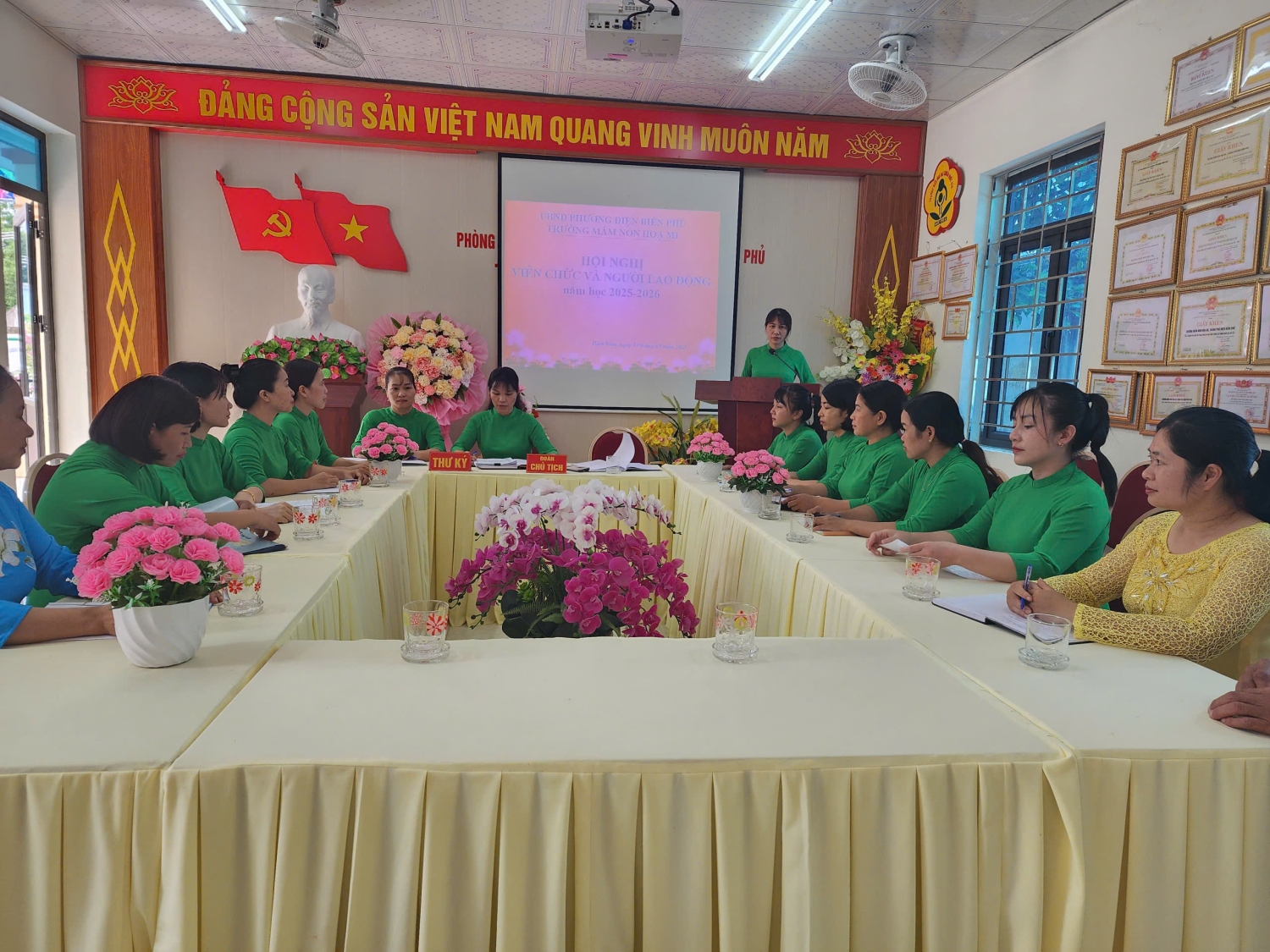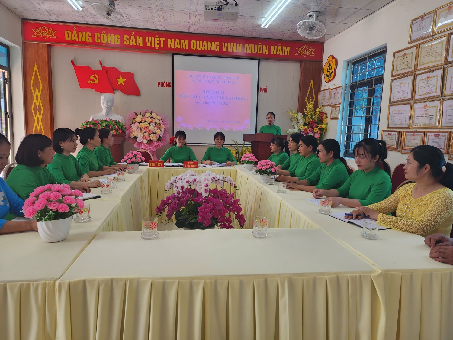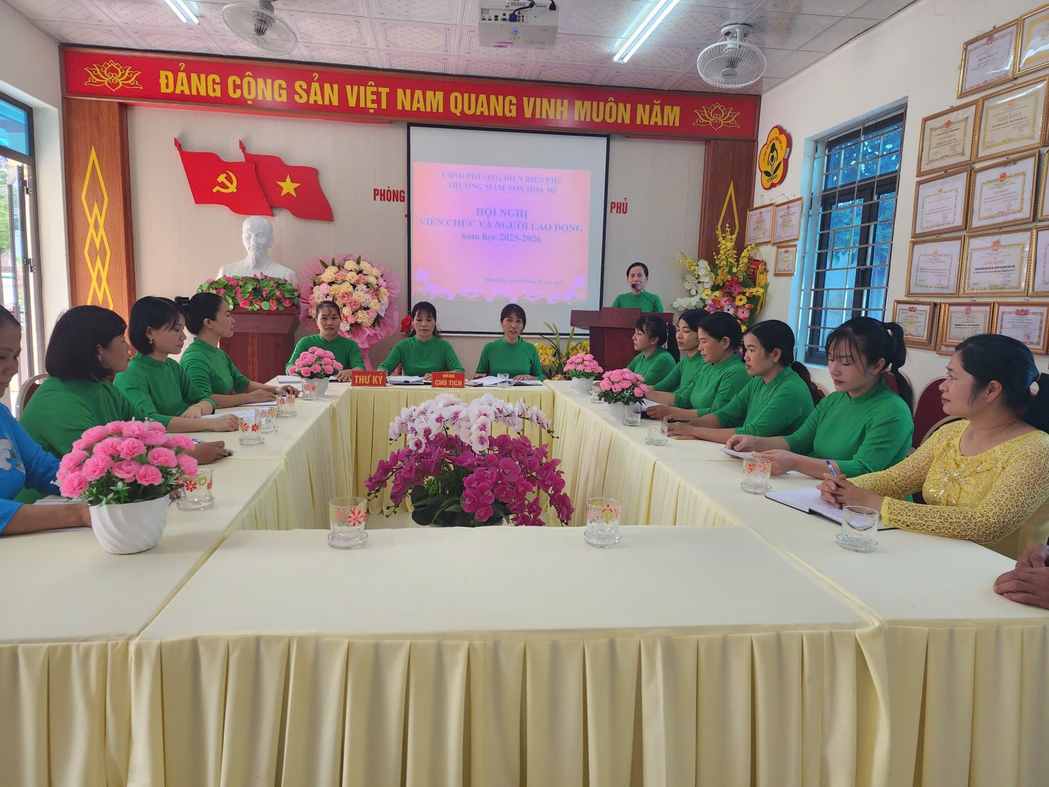 Chiều ngày 19/09/2025 trường Mầm non Hoạ Mi, phường Điện Biên Phủ đã tổ chức Hội nghị viên chức và người lao động năm học 2025 -2026. Đây là dịp quan trọng để toàn thể viên chức, người lao động trong nhà trường cùng đánh giá, nhìn lại những kết quả đã đạt được trong năm học 2024-2025, đồng thời đề ra phương hướng, nhiệm vụ và giải pháp thực hiện cho năm học 2025-2026. Tham dự và chỉ đạo hội nghị có đồng chí: Nguyễn Thị Hằng – Bí thư chi bộ, P.Hiệu trưởng phụ trách trường và sự có mặt đông đủ của toàn thể cán bộ, giáo viên, nhân viên nhà trường. Tại hội nghị, viên chức và người lao động đã được nghe báo cáo kết quả thực hiện nghị quyết hội nghị viên chức, người lao động năm học 2024-2025 và mục tiêu, nhiệm vụ, giải pháp năm học 2025-2026; tham gia đóng góp ý kiến xây dựng quy chế hoạt động, quy chế chi tiêu trong nhà trường. Không khí Hội nghị diễn ra nghiêm túc, dân chủ và đoàn kết, thể hiện tinh thần trách nhiệm cao của mỗi đồng chí viên chức, người lao động. Cũng trong Hội nghị đã nhận được nhiều ý kiến góp ý của viên chức, người lao động, các ý kiến tập trung vào các giải pháp nâng cao chất lượng chăm sóc, nuôi dưỡng, giáo dục đáp ứng yêu cầu đổi mới trong giáo dục; đổi mới phương pháp dạy học; đẩy mạnh ứng dụng công nghệ thông tin và chuyển đổi số; xây dựng môi trường học tập an toàn, thân thiện, hạnh phúc theo quan điểm “lấy trẻ làm trung tâm” đáp ứng chủ đề năm học 2025-2026 "Kỷ cương - sáng tạo - đột phá - phát triển" và chuẩn bị tốt các điều kiện để triển khai Chương trình Giáo dục mầm non mới. Phát biểu tại hội nghị, đồng chí Nguyễn Thị Hằng – Bí thư chi bộ, P.Hiệu trưởng phụ trách trường đã ghi nhận và biểu dương những nỗ lực, thành tích mà tập thể, cá nhân của nhà trường đã đạt được trong năm học 2024-2025, đồng thời đề nghị toàn thể cán bộ, giáo viên, nhân viên tiếp tục phát huy tinh thần đoàn kết, trách nhiệm, sáng tạo, vượt qua những khó khăn, thách thức để hoàn thành xuất sắc nhiệm vụ năm học 2025- 2026. Kết thúc hội nghị, toàn thể viên chức và người lao động nhà trường đã biểu quyết thông qua Nghị quyết hội nghị với sự nhất trí cao, thể hiện tinh thần đoàn kết, trách nhiệm và quyết tâm hoàn thành thắng lợi nhiệm vụ năm học 2025- 2026 Sau một buổi chiều làm việc khẩn trương, nghiêm túc. Với sự đồng lòng, nhất trí cao, Hội nghị viên chức, người lao động Trường Mầm non Họa Mi, phường Điện Biên Phủ năm học 2025 - 2026 đã thành công tốt đẹp, mở ra một năm học mới với nhiều niềm tin và kỳ vọng. Chúc tập thể sư phạm nhà trường luôn vững mạnh, đoàn kết, đổi mới, sáng tạo và gặt hái thêm nhiều thành công trong năm học 2025-2026. Dưới đây là một số hình ảnh tại Hội nghị: