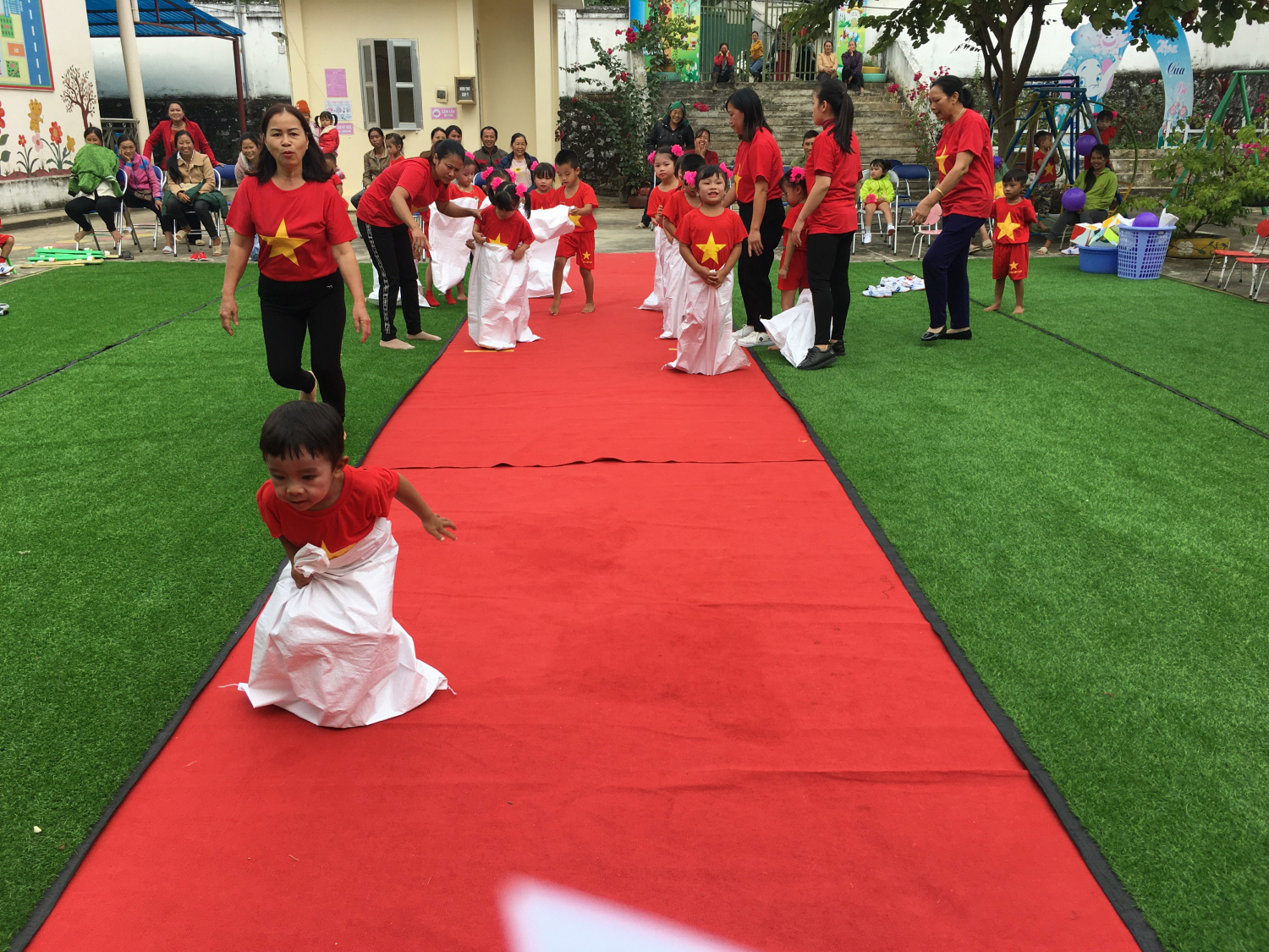 Tiếp đó các bé được giao lưu và trải nghiệm trò chơi vô cùng hấp dẫn, đầy hào hứng như: Chuyền bong bằng lưng, bằng bụng và đi theo đường dích dắc; trò chơi đôi dép thần kỳ; nhảy bao bố; kéo co. Các trò chơi này giúp các bé phát triển khả năng phối hợp, sự khéo léo và tinh thần đồng đội.