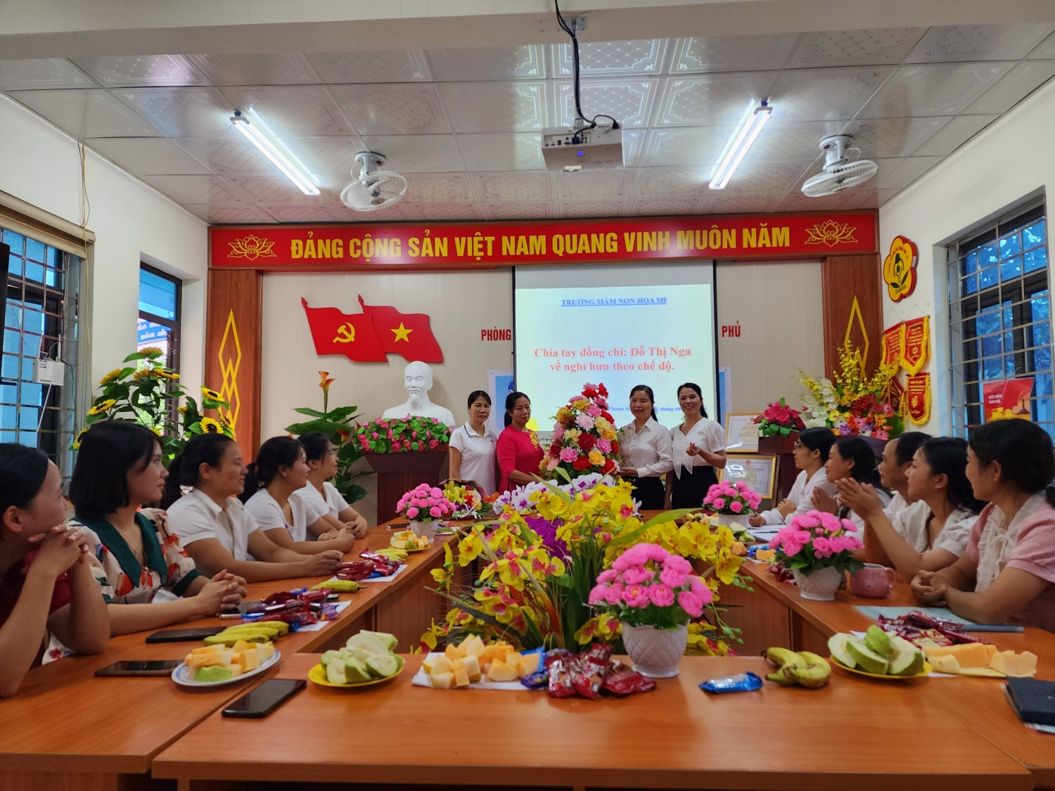 Hôm ngày 01 tháng 08 năm 2024 giáo viên Trường mầm non Hoạ Mi tổ chức chia tay một đồng chí đó là đồng chí Đỗ Thị Nga đã được nghỉ hưu theo quyết định Số: 853/QĐ- UBND Thành Phố Điện Biên Phủ ngày 14 tháng 05 năm 2024.