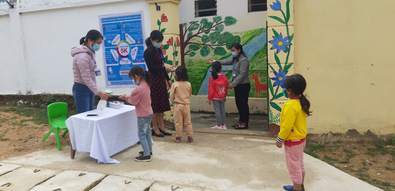 Trước khi vào học, nhà trường đã giao giáo viên chủ nhiệm các lớp ở các điểm trường thông báo đến phụ huynh học sinh qua hệ thống tin nhắn Zalo, tin nhắn thoại về kế hoạch đi học trở lại để duy trì sĩ số lớp học, ổn định nề nếp, tác phong học sinh. Song song đó, nhà trường cũng chuẩn bị đầy đủ máy đo thân nhiệt, bố trí đầy đủ vòi nước rửa tay, dung dịch rửa tay sát khuẩn và tăng cường tuyên truyền cho phụ huynh thường xuyên theo dõi sức khỏe cho trẻ và cho trẻ đeo khẩu trang từ nhà đến trường, đặc biệt lưu ý phụ huynh chỉ đưa trẻ đến cổng trường chứ không bước vào khuôn viên trường, cũng như nhà trường tạm dừng tổ chức ăn bán trú, mà chỉ cho trẻ học 2 buổi/ngày để đảm bảo theo quy định từ đó phụ huynh chủ động sắp xếp thời gian đưa đón trẻ hợp lý.