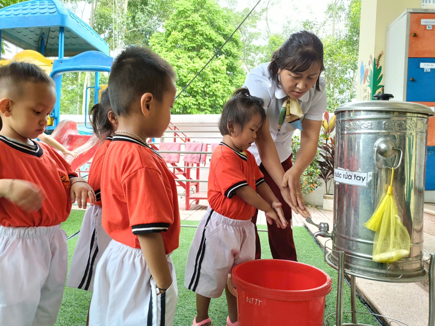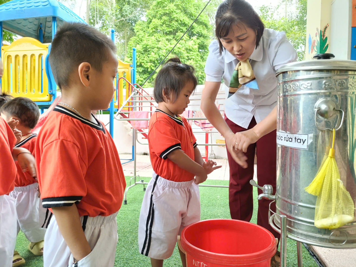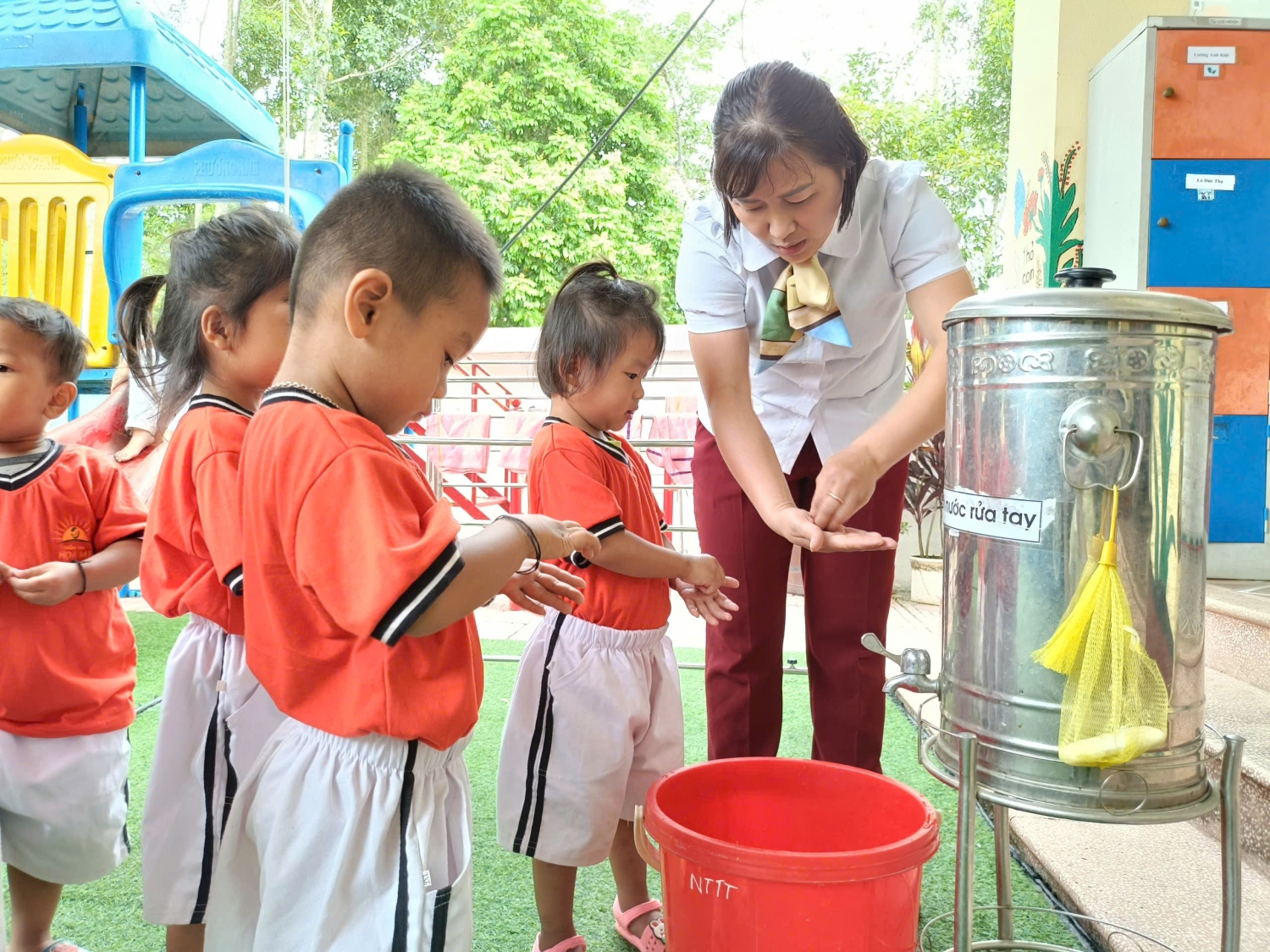 Saum no yog duab cws qhia xyuj xeeb rau qlais ntxuav tes => Dưới đây là hình ảnh cô hướng dẫn trẻ rửa tay bằng 6 bước.