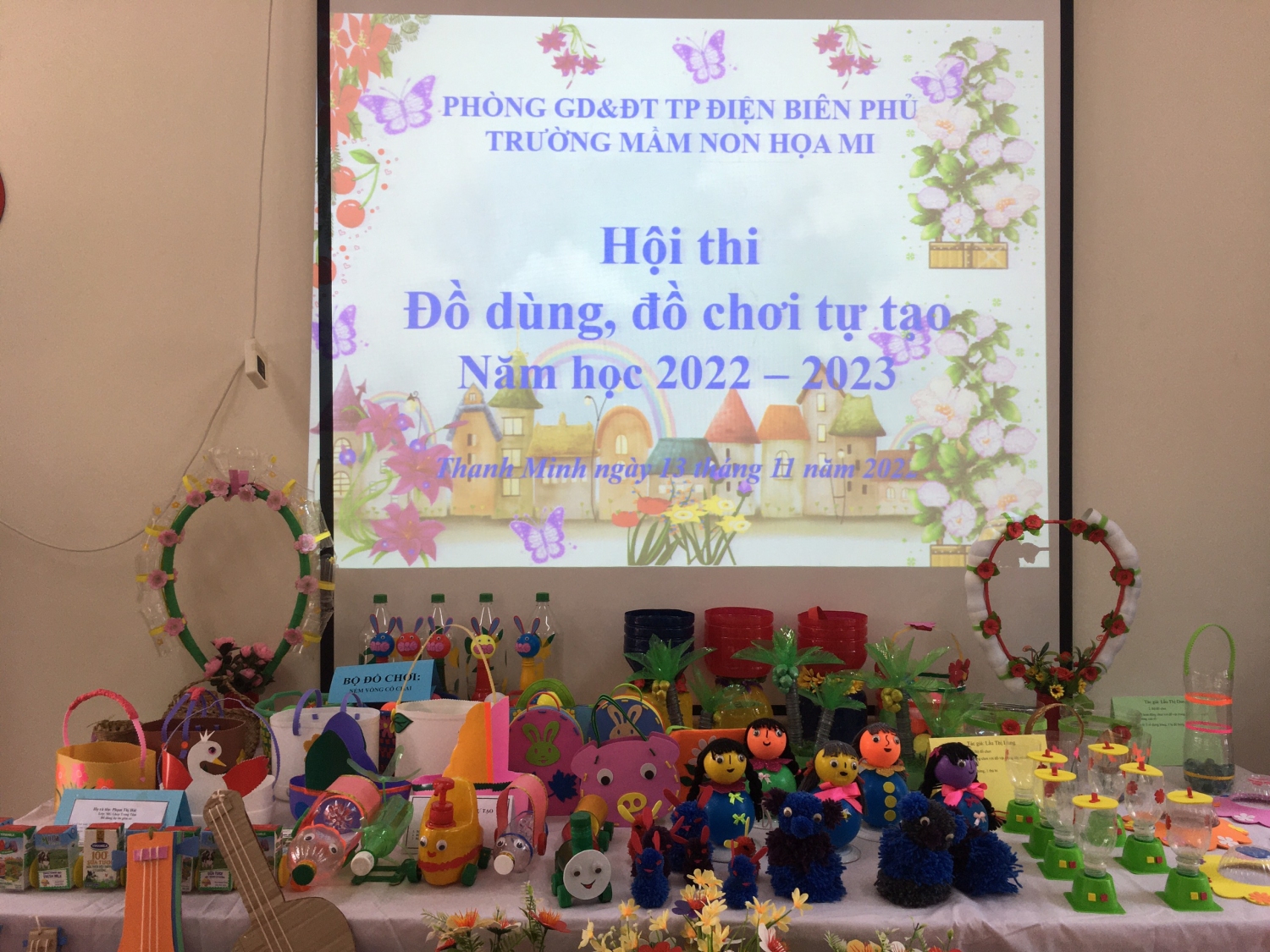 Hưởng ứng phong trào thi đua ‘Làm đồ dùng, đồ chơi sáng tạo’ của trường Mầm Non Hoạ Mi, tất cả các cán bộ giáo viên 6 lớp hưởng ứng làm đồ dùng đồ chơi phục vụ cho việc dạy và học của trẻ với số lượng đồ dùng đồ chơi nhiều và đa dạng. Cùng với bàn tay khéo léo, trí tưởng tượng của các cô và các con để ứng dụng dạy học và phục vụ cho nhu cầu vui chơi của trẻ trong năm học. Ai trong chúng ta cũng biết đến việc làm đồ dùng, đồ chơi MN là cách hữu hiệu nhất giúp trẻ thực hiện các hoạt động, đồng thời cũng chính là cách để trẻ tiếp thu, lĩnh hội các kiến thức một cách nhiệt tình, hứng thú và hiệu quả nhất.Nhận thức được điều đó, đội ngũ GV các lớp luôn biết cách tận dụng các nguyên liệu sẵn có trong gia đình và địa phương, chẳng hạn như: vỏ chai nước giải khát, vỏ hộp sữa, chai nước rửa tay, ống nhựa, que kem, quả cầu lông, các miếng gỗ nhỏ..... góp phần bảo vệ môi trường sạch đẹp, đồng thời cũng sáng tạo ra nhiều mô hình đồ dùng, đồ chơi độc đáo.Sau đây là đồ dùng đồ chơi của giáo viên làm dùng cho việc thoả mán nhu cầu hoc và vui chơi của trẻ với màu sắc sặc sỡ đẹp rực rỡ, với nhiều đồ đồ dùng được trưng bày