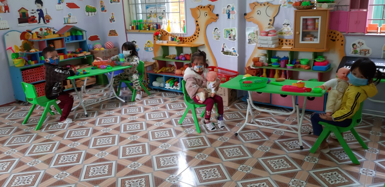 Tại các lớp học, các con được các cô duy trì thường xuyên công tác đeo khẩu trang trong lớp, trong hoạt động học các bé luôn giữ khoảng cách vị trí ngồi đảm bảo an toàn theo đúng quy định của lớp học....