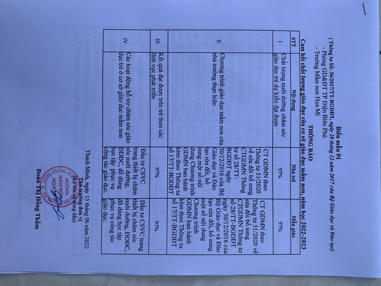 NỘI DUNG THỰC HIỆN CÔNG KHAI CỦA TRƯỜNG MẦM NON HOẠ MI 2022-2023