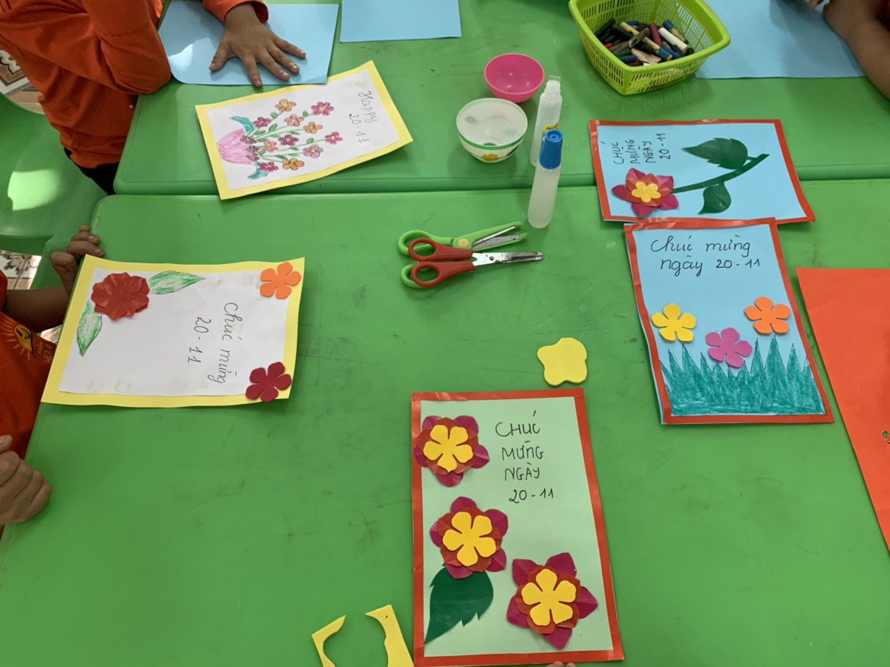 Cũng dịp này, sáng ngày 14/11/2022 lớp mẫu giáo ghép 4-6 tuổi Trung tâm,Trường mầm non Họa Mi đã tổ chức hoạt động trải nghiệm chào mừng ngày Nhà Giáo Việt Nam với chủ đề “Cô giáo của con” trong bầu không khí tràn ngập sắc màu và đầy cảm xúc của các cô giáo, các bậc phụ huynh và các bé. Đây là hoạt động trẻ được tự do sáng tạo theo ý thích và khả năng của mình. Thông qua hoạt động nhằm tôn vinh, thể hiện tình cảm biết ơn, kính trọng với các cô giáo – người mẹ hiền thứ 2 của trẻ. Điểm nhấn trong buổi Hoạt động trảinghiệm là những tấm bưu thiếp, những bó hoa, lãng hoa, những bức tranh làm từ những nguyên vật liệu dễ kiếm dễ tìm, trẻ tự cắt, vẽ để tạo ra những bông hoa xinh xắn để tặng cô giáo nhân dịp 20/11 do các bé trổ tài.