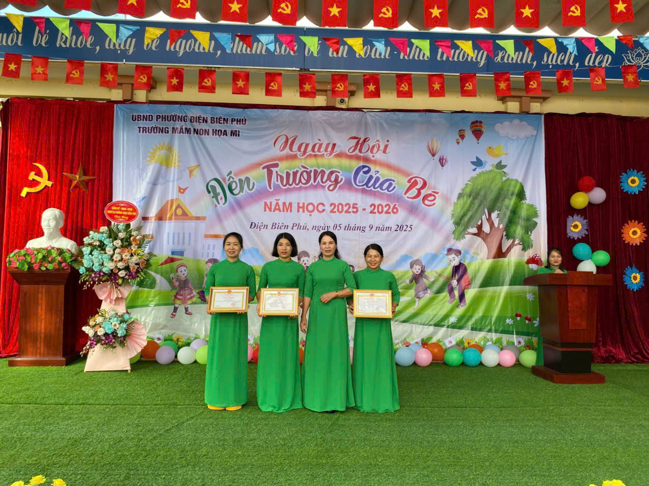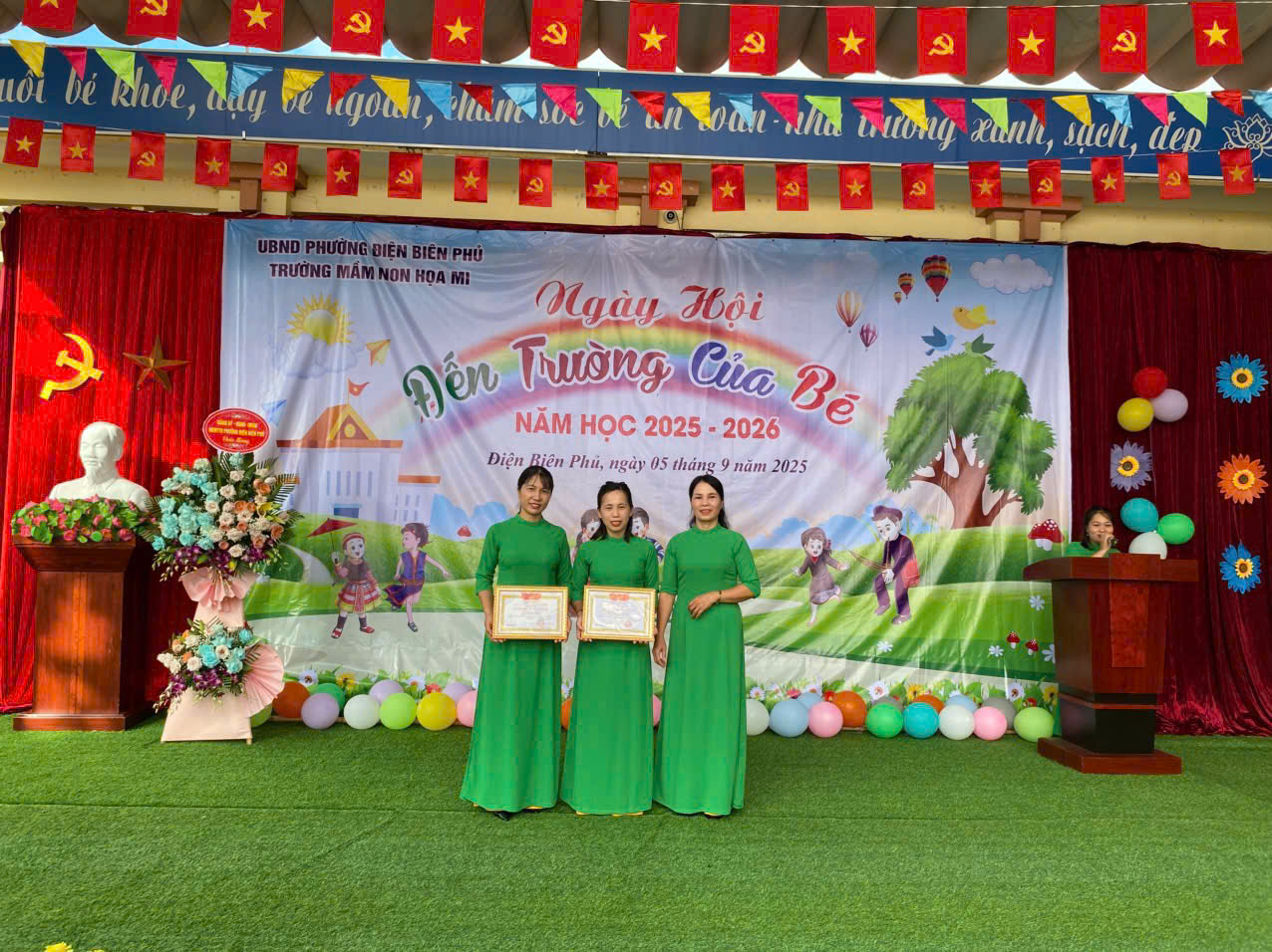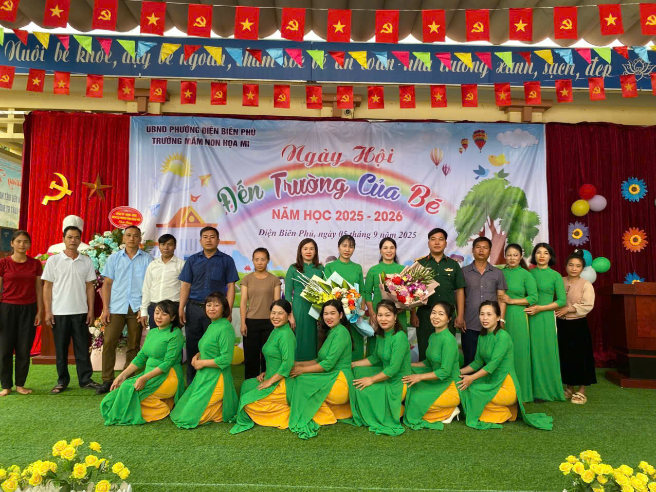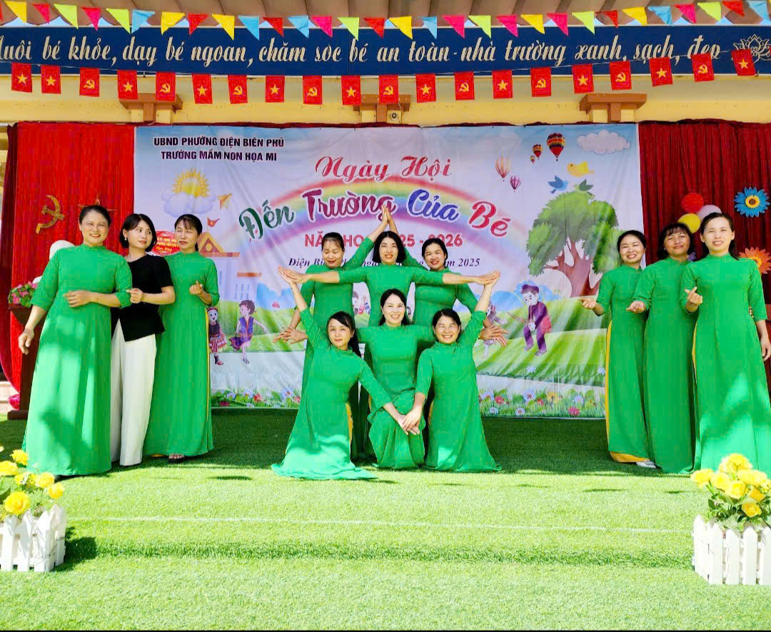 Hôm nay sáng ngày 5/9/2025 trong không khí trang trọng và rộn ràng của ngày toàn dân đưa trẻ đến trường, trường Mầm non Hoạ Mi tổ chức Lễ Khai giảng năm học 2025–2026 và tiếp sóng Lễ kỷ niệm 80 năm truyền thống ngành giáo dục của Bộ GD&ĐT - một sự kiện lịch sử đầy ý nghĩa đánh dấu hành trình xây dựng và phát triển của nền giáo dục Việt Nam, gắn với 80 mùa xuân hào hùng và tươi đẹp của đất nước. Tham dự buổi lễ khai giảng với nhà trường có Bà Lò Thị Thanh – Ủy viên BCH Đảng bộ, phó trưởng ban VH-XH HĐND phường Điện Biên Phủ, đơn vị kết nghĩa, đại diện hội cha mẹ học sinh nhà trường và hội trưởng hội phụ huynh của các lớp. Đ/c Nguyễn Thị Hằng – Bí thư chi bộ, Phó hiệu trưởng nhà trường,Đ/c Lê Thị Hồng phó hiệu trưởng nhà trường, cùng các Đ/c giáo viên, nhân viên, các bậc phụ huynh và toàn thể các cháu học sinh trong nhà trường. Trong buổi lễ khai giảng đầu năm học thì không thể thiếu đó là các tiết mục văn nghệ sôi động, đáng yêu đã góp phần mang lại không khí rộn ràng, cho buổi lễ tràn ngập niềm vui. Phần lễ trực tiếp tại sân trường của chúng ta xin được khép lại tại đây. Và ngay sau đây là: kính mời quý vị, thầy cô và các em học sinh tiếp tục theo dõi chương trình: “Khai giảng trực tuyến năm học 2025-2026 trên nền tảng trực tuyến của nhà trường, trong chương trình các cô và các bé đã được lắng nghe diễn văn của Bộ trưởng bộ GD-ĐT Nguyễn Kim Sơn, xem lại quá trình phát triển của nền giáo dục nước nhà qua chặng đường 80 năm và lắng nghe tiếng trống khai giảng năm học mới của Tổng bí thư Tô Lâm . Với sự quan tâm của các cấp lãnh đạo và tình cảm nồng nhiệt của các bậc phụ huynh cũng như nhân dân trên địa bàn, cùng với niềm tự hào lan tỏa trong mỗi giáo viên sau khi xem lại chặng đường 80 năm giáo dục phát triển đất nước càng khiến nhà trường và các cô giáo thổi bùng lên niềm tin vững bước tiến vào năm học mới. Buổi lễ khai giảng đã kết thúc trong niềm hân hoan của cả cô và trò trong nhà trường.Tạo được không khí vui tươi và phấn khởi ngập tràn niềm vui, tự hào và thành công.