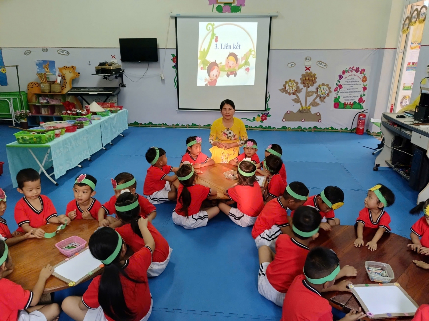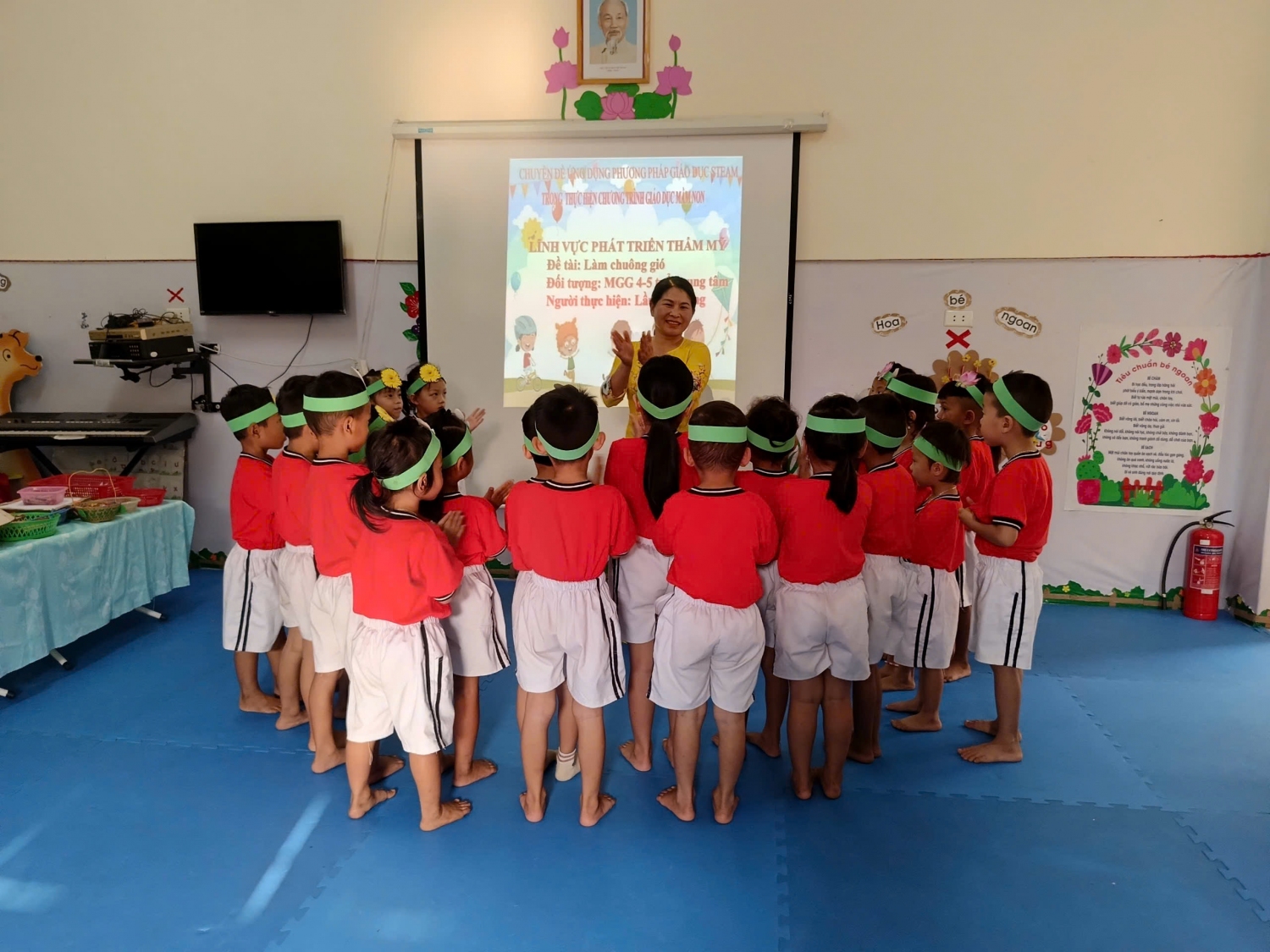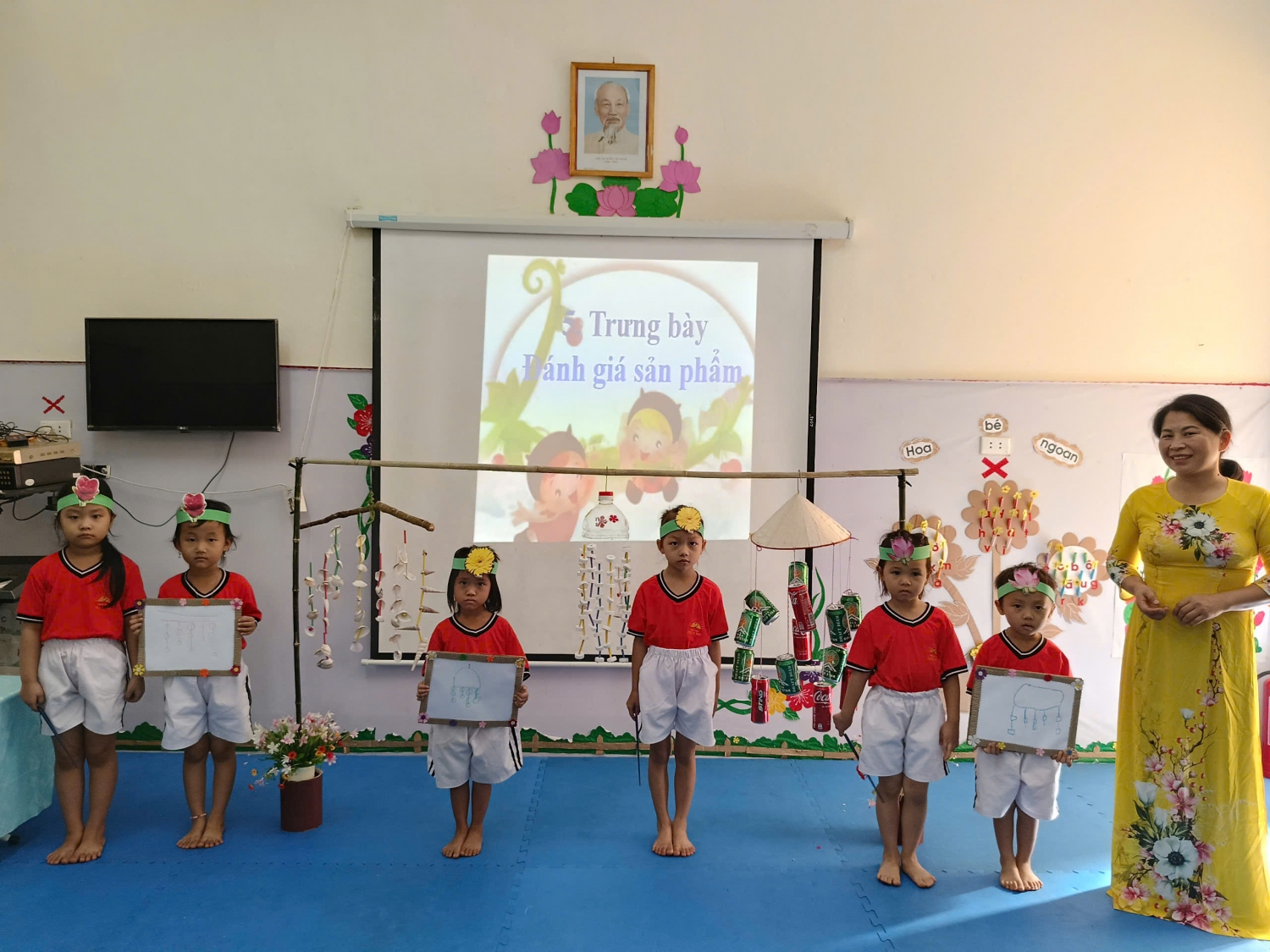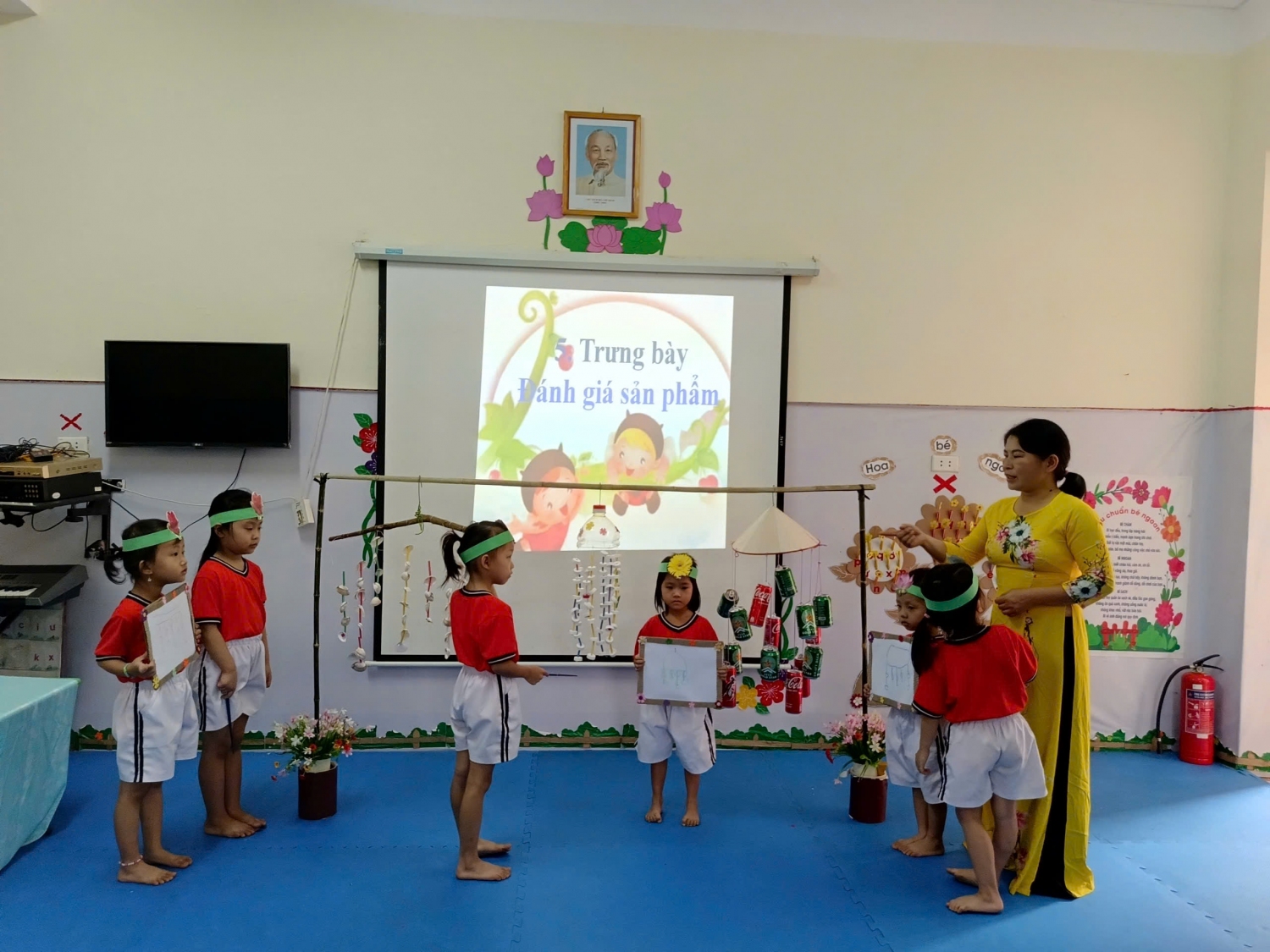 Áp dụng quy trình thiết kế kỹ thuật (EDP), tổ chuyên môn đã tổ chức thực hiện đề tài "Làm chuông gió - EDP" do cô giáo Lầu Thị Dung thực hiện trực tiếp tại lớp MGG 4-5 tuổi Trung Tâm. Với mục đích giúp trẻ phát triển các kỹ năng tư duy phản biện, giải quyết vấn đề, sáng tạo và hợp tác. Trẻ được khám phá để tiếp nhận các kiến thức, kỹ năng từ đó hiểu, ghi nhớ nhanh hơn và phát huy khả năng quan sát, nhanh nhạy, thử nghiệm, giải thích, đặt câu hỏi để tìm nguyên nhân và đưa ra các suy luận/ kết luận. Cô chia trẻ thành 3 nhóm cùng thảo luận để đưa ra ý tưởng thiết kế chiếc chuông gió của đội mình. Trẻ được sử dụng các dụng cụ và nguyên vật liệu đơn giản như: Kéo, ống hút nhựa, nắp chai, vỏ sò, vỏ lon bia, lon nước ngọt, cành khô, nón lá, bình nhựa, dây len,...để làm chiếc chuông gió. Sản phẩm đạt được trên cả mong đợi, 3 đội đã hoàn thiện được 3 chiếc chuông gió với ý tưởng và nguyên vật liệu khác nhau, trẻ còn tự tin thuyết trình và giới thiệu được sản phẩm của mình. Qua đó, cho chúng ta thấy được khi vận dụng quy trình thiết kế kỹ thuật (EDP) trong tổ chức hoạt động cho trẻ mang lại lợi ích tuyệt vời, hỗ trợ các bé khám phá tiềm năng của bản thân, hình thành kỹ năng cần thiết để vận dụng và phát triển trong thế giới công nghệ hiện đại. Trẻ sẽ có những hoạt động, bài học, trò chơi thú vị kích thích trí tò mò, sự sáng tạo và phát huy khả năng tiềm ẩn của bé.