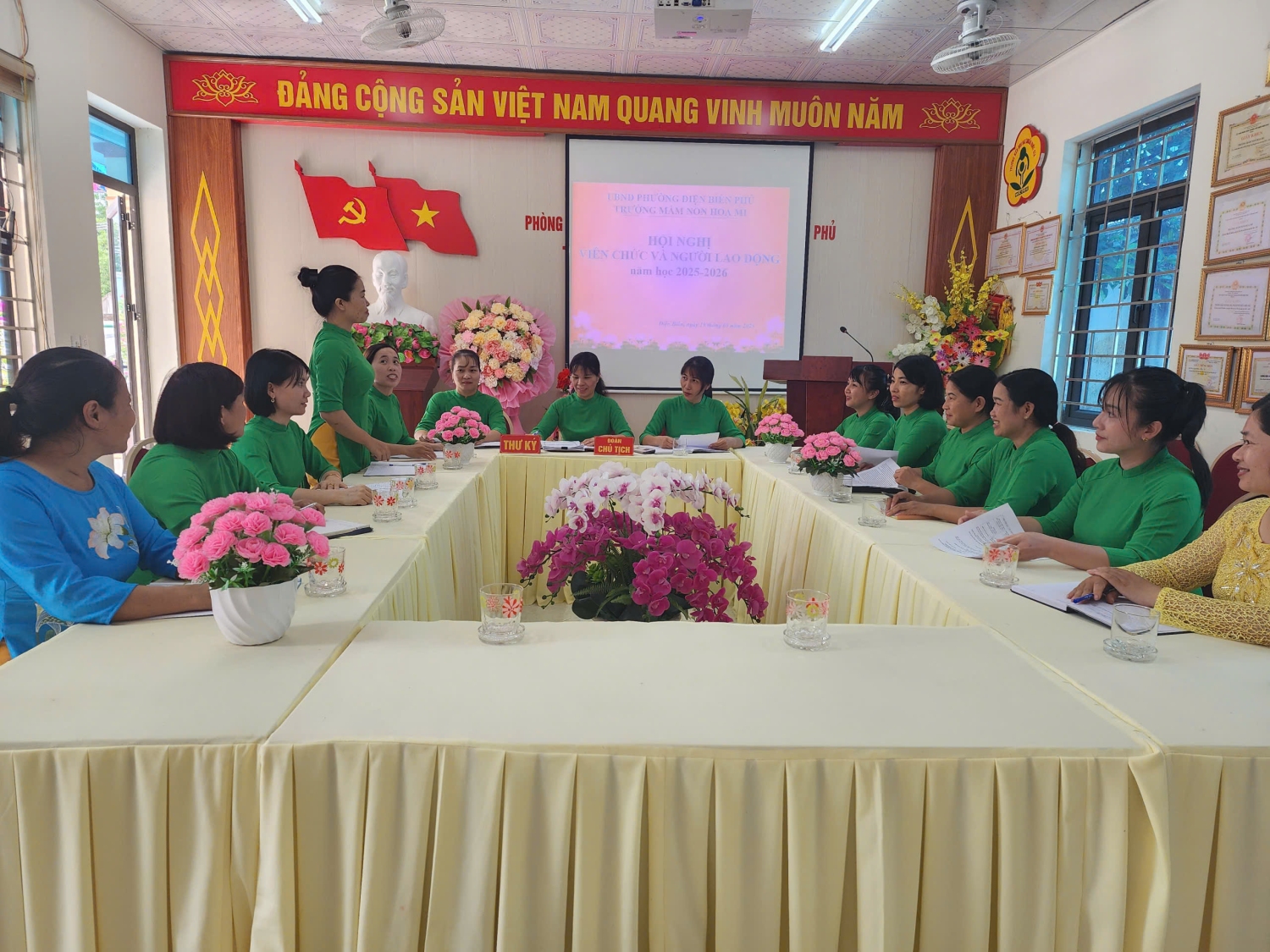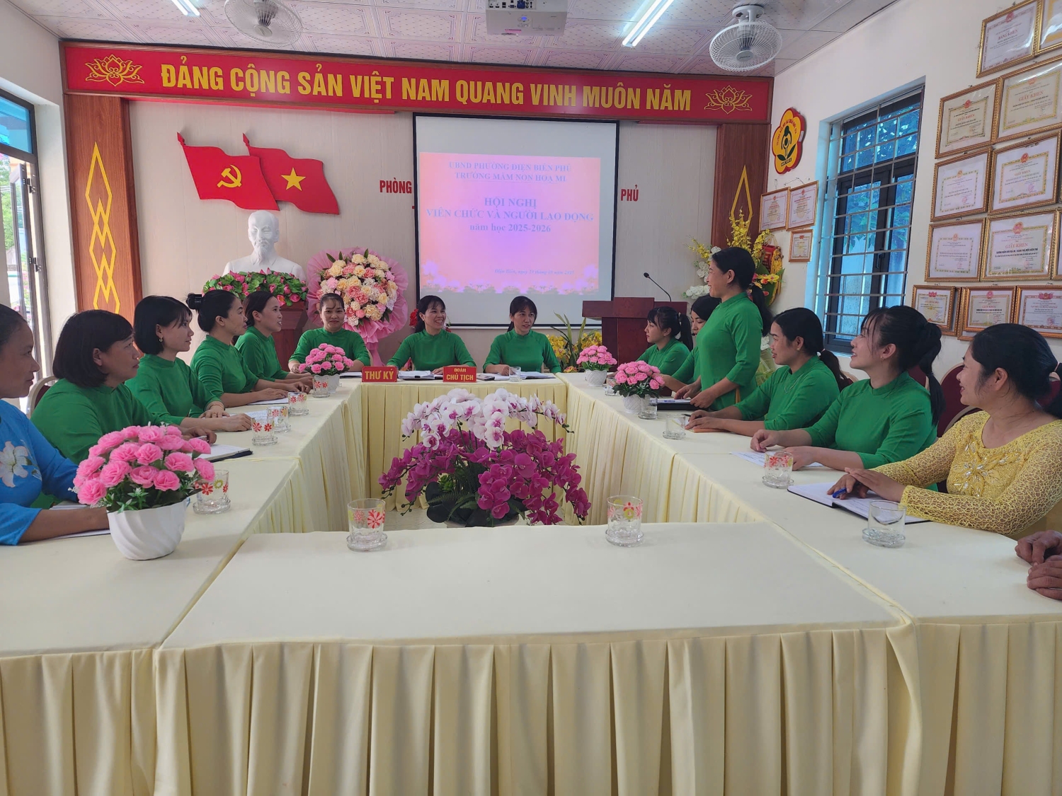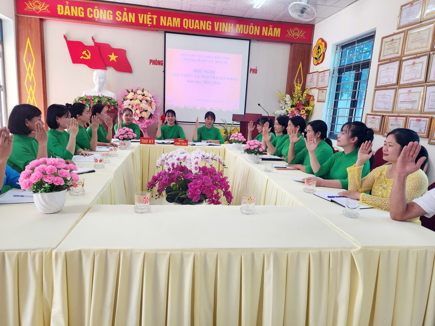 Chiều ngày 19/09/2025 trường Mầm non Hoạ Mi, phường Điện Biên Phủ đã tổ chức Hội nghị viên chức và người lao động năm học 2025 -2026. Đây là dịp quan trọng để toàn thể viên chức, người lao động trong nhà trường cùng đánh giá, nhìn lại những kết quả đã đạt được trong năm học 2024-2025, đồng thời đề ra phương hướng, nhiệm vụ và giải pháp thực hiện cho năm học 2025-2026. Tham dự và chỉ đạo hội nghị có đồng chí: Nguyễn Thị Hằng – Bí thư chi bộ, P.Hiệu trưởng phụ trách trường và sự có mặt đông đủ của toàn thể cán bộ, giáo viên, nhân viên nhà trường. Tại hội nghị, viên chức và người lao động đã được nghe báo cáo kết quả thực hiện nghị quyết hội nghị viên chức, người lao động năm học 2024-2025 và mục tiêu, nhiệm vụ, giải pháp năm học 2025-2026; tham gia đóng góp ý kiến xây dựng quy chế hoạt động, quy chế chi tiêu trong nhà trường. Không khí Hội nghị diễn ra nghiêm túc, dân chủ và đoàn kết, thể hiện tinh thần trách nhiệm cao của mỗi đồng chí viên chức, người lao động. Cũng trong Hội nghị đã nhận được nhiều ý kiến góp ý của viên chức, người lao động, các ý kiến tập trung vào các giải pháp nâng cao chất lượng chăm sóc, nuôi dưỡng, giáo dục đáp ứng yêu cầu đổi mới trong giáo dục; đổi mới phương pháp dạy học; đẩy mạnh ứng dụng công nghệ thông tin và chuyển đổi số; xây dựng môi trường học tập an toàn, thân thiện, hạnh phúc theo quan điểm “lấy trẻ làm trung tâm” đáp ứng chủ đề năm học 2025-2026 "Kỷ cương - sáng tạo - đột phá - phát triển" và chuẩn bị tốt các điều kiện để triển khai Chương trình Giáo dục mầm non mới. Phát biểu tại hội nghị, đồng chí Nguyễn Thị Hằng – Bí thư chi bộ, P.Hiệu trưởng phụ trách trường đã ghi nhận và biểu dương những nỗ lực, thành tích mà tập thể, cá nhân của nhà trường đã đạt được trong năm học 2024-2025, đồng thời đề nghị toàn thể cán bộ, giáo viên, nhân viên tiếp tục phát huy tinh thần đoàn kết, trách nhiệm, sáng tạo, vượt qua những khó khăn, thách thức để hoàn thành xuất sắc nhiệm vụ năm học 2025- 2026. Kết thúc hội nghị, toàn thể viên chức và người lao động nhà trường đã biểu quyết thông qua Nghị quyết hội nghị với sự nhất trí cao, thể hiện tinh thần đoàn kết, trách nhiệm và quyết tâm hoàn thành thắng lợi nhiệm vụ năm học 2025- 2026 Sau một buổi chiều làm việc khẩn trương, nghiêm túc. Với sự đồng lòng, nhất trí cao, Hội nghị viên chức, người lao động Trường Mầm non Họa Mi, phường Điện Biên Phủ năm học 2025 - 2026 đã thành công tốt đẹp, mở ra một năm học mới với nhiều niềm tin và kỳ vọng. Chúc tập thể sư phạm nhà trường luôn vững mạnh, đoàn kết, đổi mới, sáng tạo và gặt hái thêm nhiều thành công trong năm học 2025-2026. Dưới đây là một số hình ảnh tại Hội nghị: