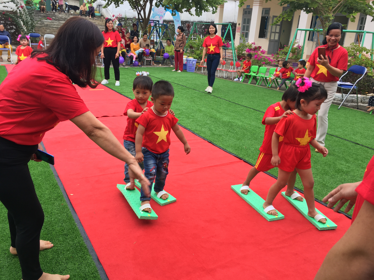 Tiếp đó các bé được giao lưu và trải nghiệm trò chơi vô cùng hấp dẫn, đầy hào hứng như: Chuyền bong bằng lưng, bằng bụng và đi theo đường dích dắc; trò chơi đôi dép thần kỳ; nhảy bao bố; kéo co. Các trò chơi này giúp các bé phát triển khả năng phối hợp, sự khéo léo và tinh thần đồng đội.